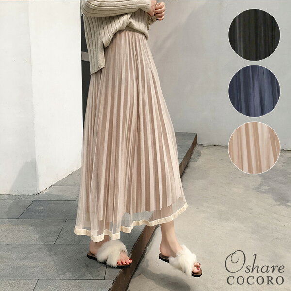 この商品について 7418【チュールベロアプリーツスカート】 ベロア素材で光沢のある上品なインナーに、歩くたびに揺れるチュールが大人ガーリーな印象。